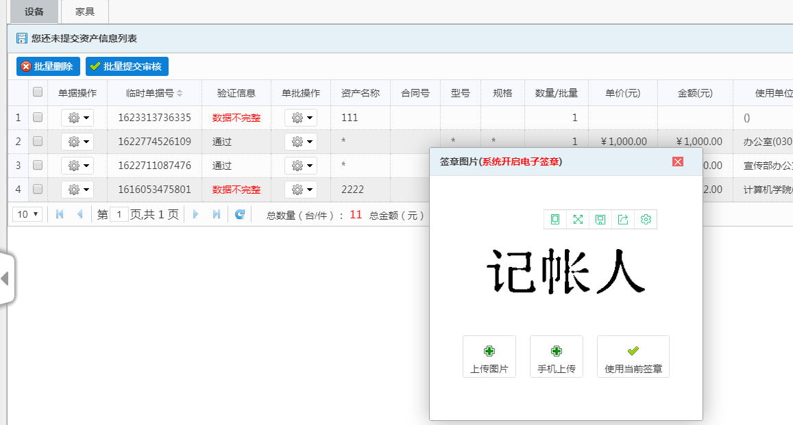 此功能能够对已【提交】但还未审核的资产信息进行修改、删除和打印等操作。操作菜单为:左侧“资产入账→资产登记→资产信息补填”菜单。